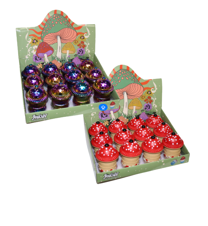 A bold and colorful grinder featuring a Jamaican-inspired mushroom design that instantly catches attention. Made from durable metal with sharp, efficient teeth, it delivers smooth, consistent grinding with every twist. The compact size makes it easy to carry, while the vibrant artwork gives it strong visual appeal for smoke shops and novelty displays.
